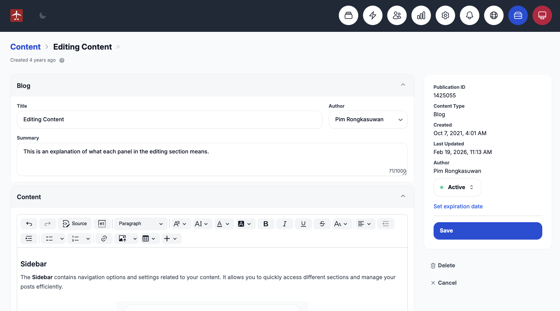 The Sidebar contains navigation options and settings related to your content. It allows you to quickly access different sections and manage your posts efficiently.